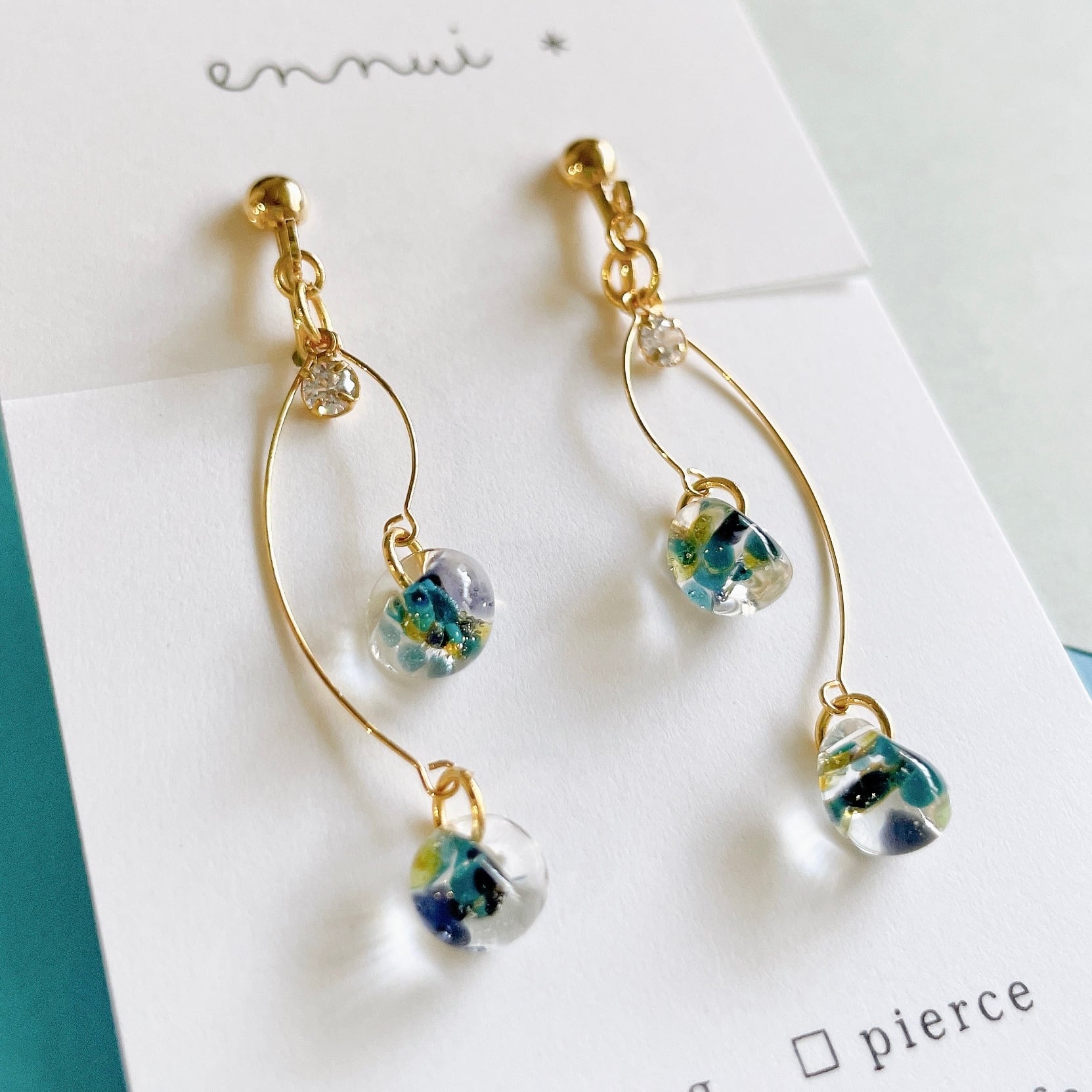 透明感のあるガラスビーズは、陽の光を浴びるときらきら輝き、耳元に印象的な余韻を添えます。