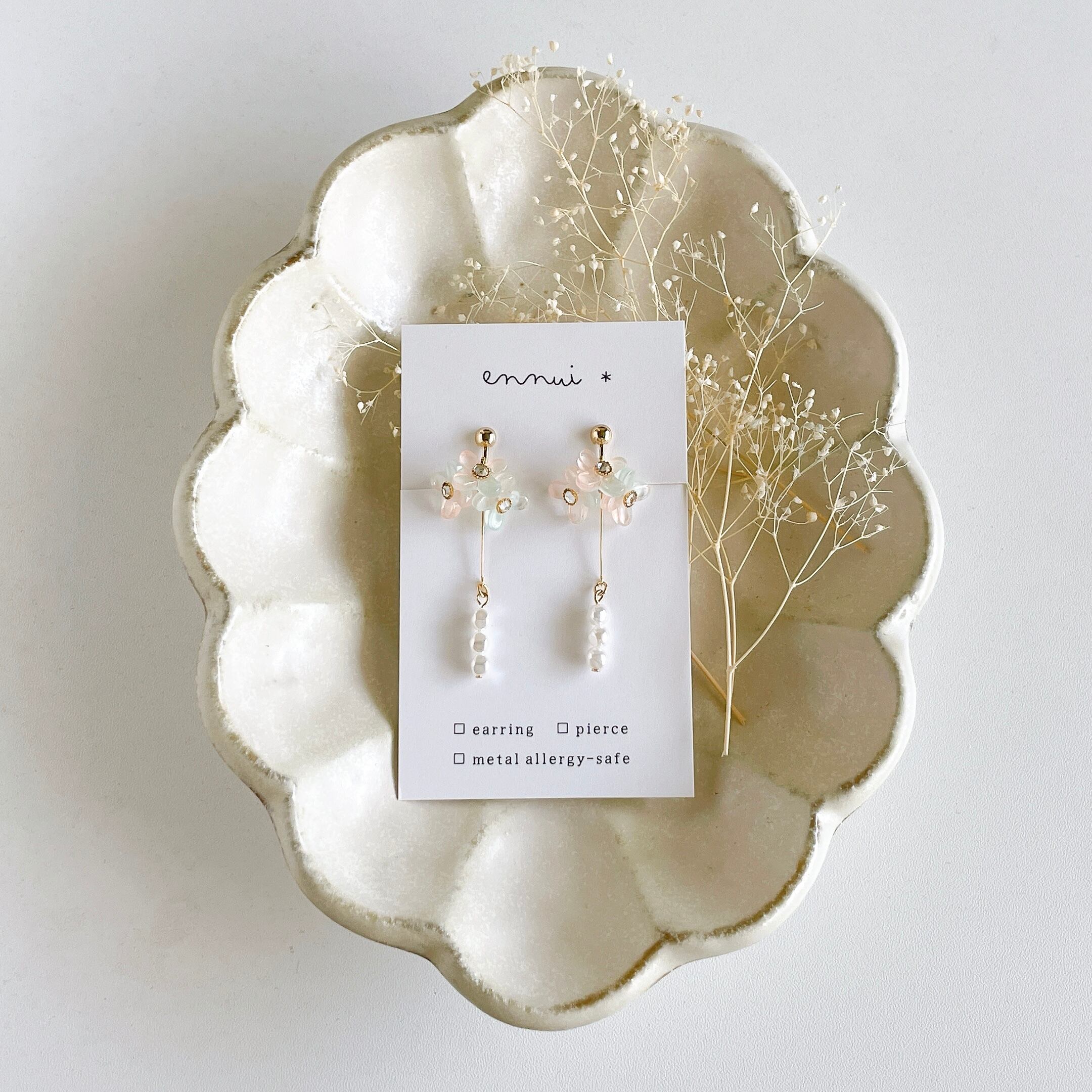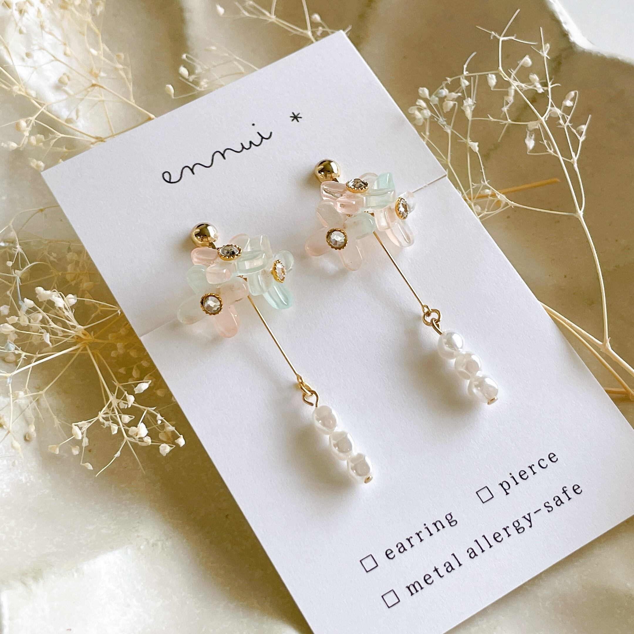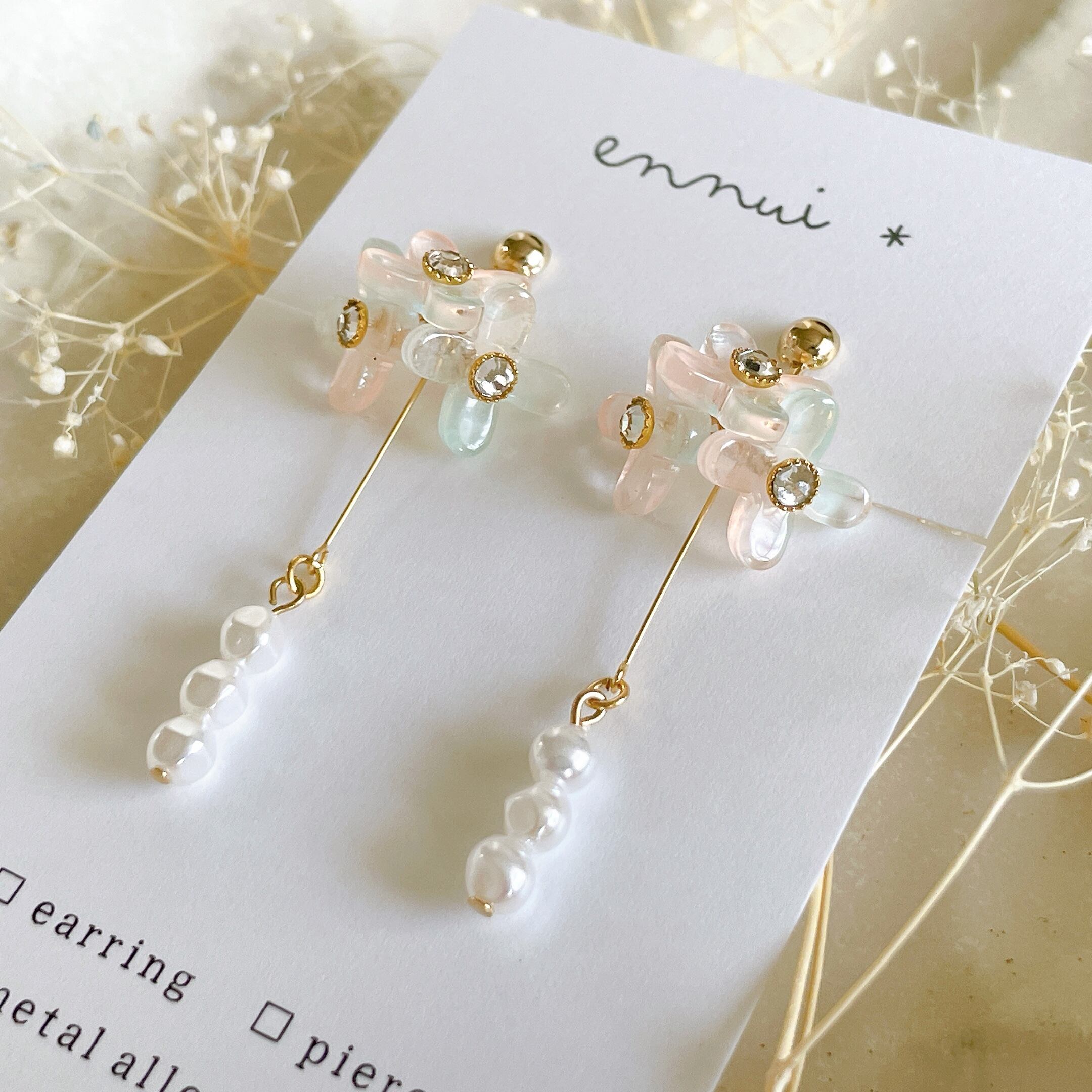 青からオレンジへ移り変わる、淡い空のニュアンスを閉じ込めたお花の形のガラスビーズを、ブーケのように束ねてイヤリング/ピアスに仕上げました◎