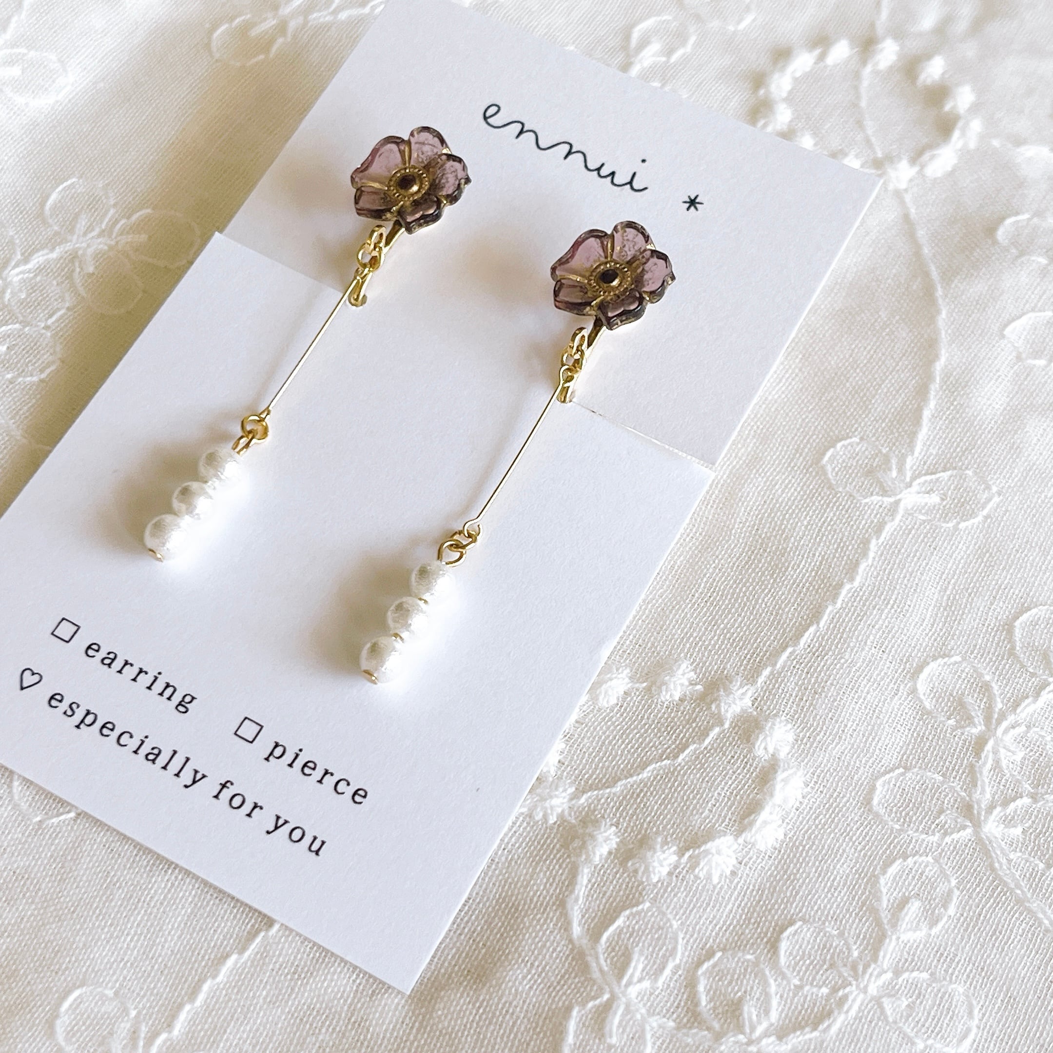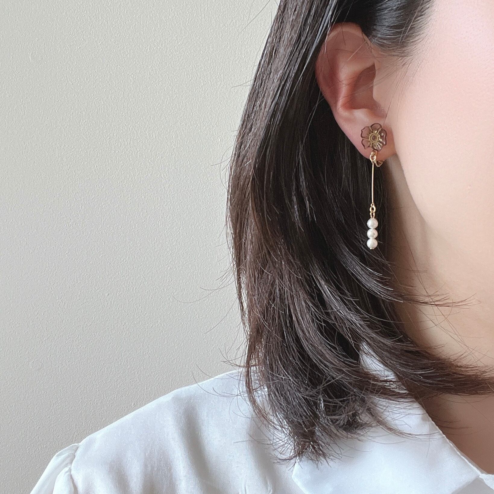 ドイツ製のお花のビーズにコットンパールをあわせ、クラシカルな雰囲気に仕立てたイヤリング/ピアスです。