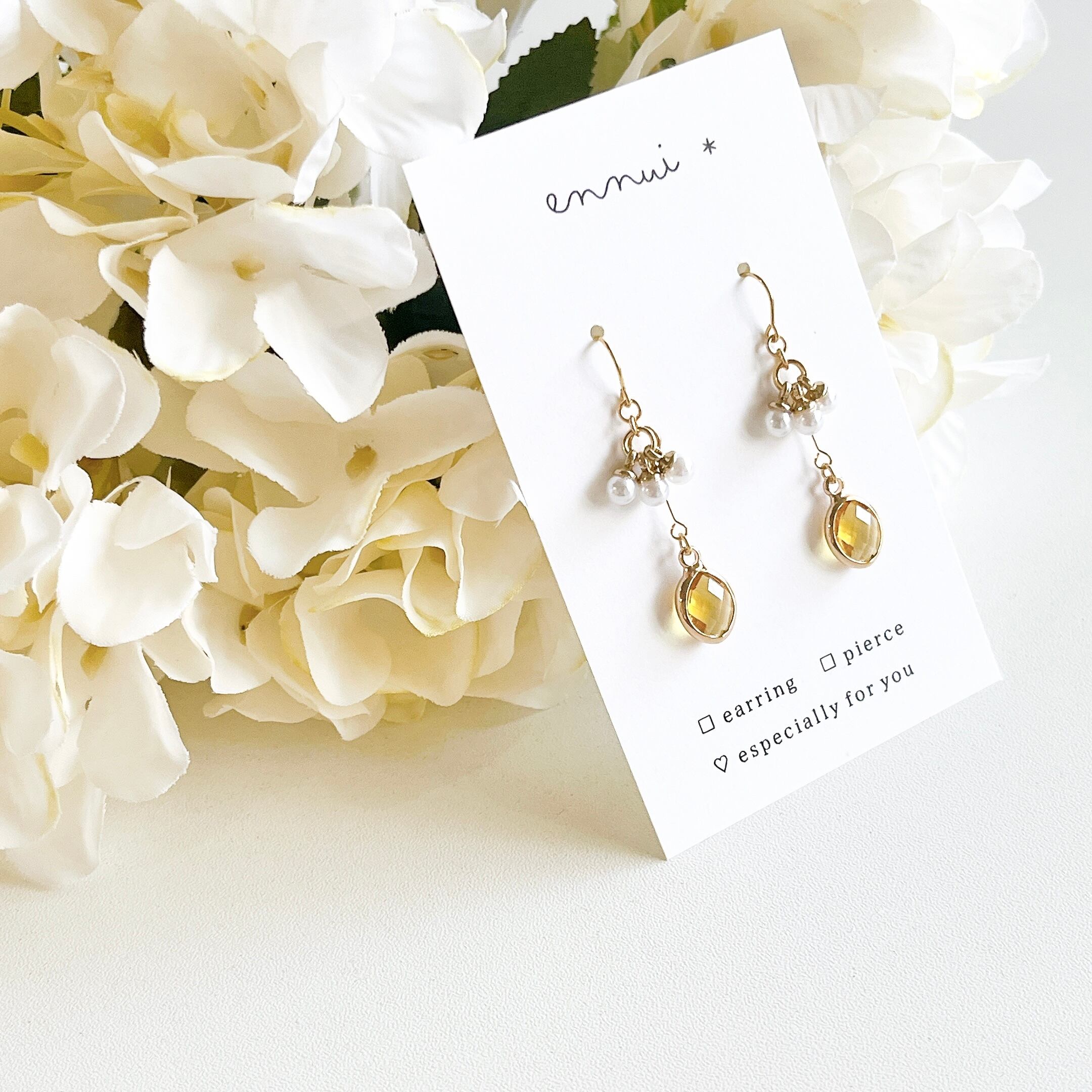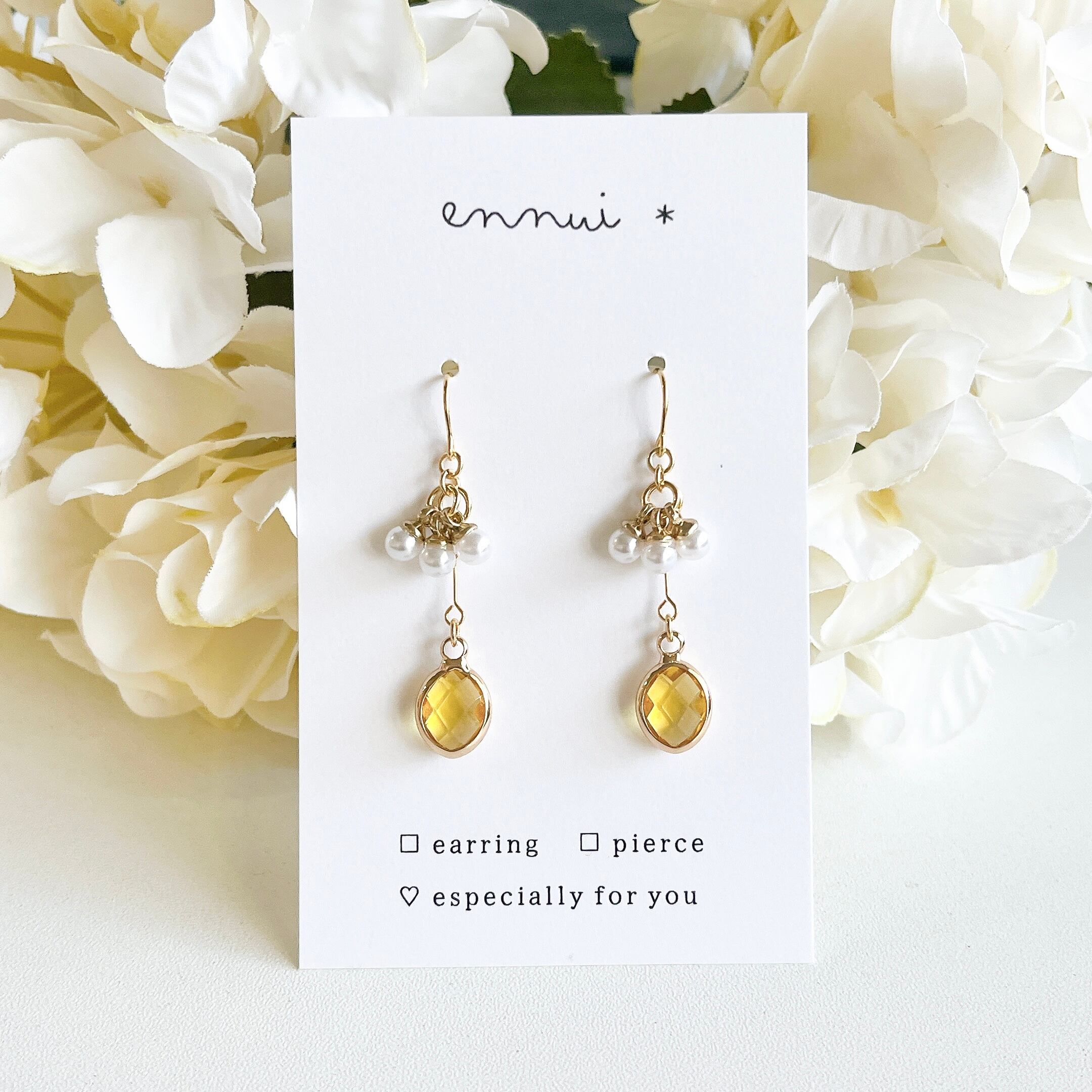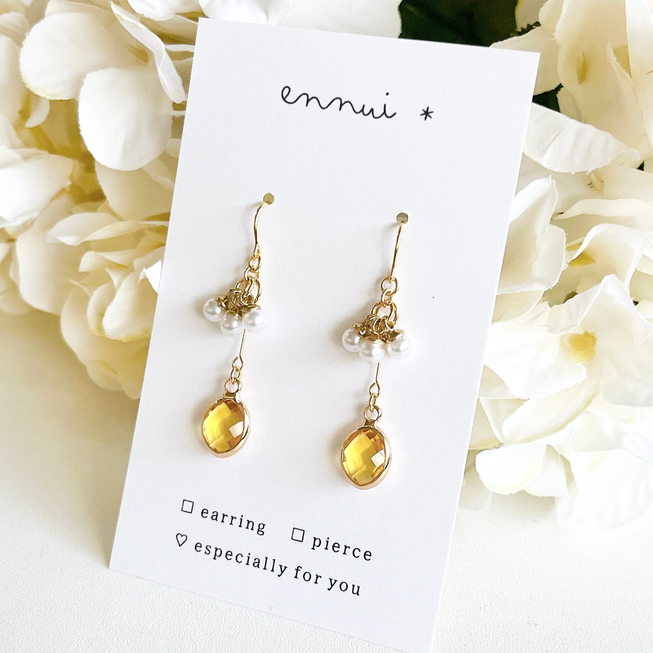 レモン色のガラスチャームに、小粒のパールチャームをフリルのようにあしらったイヤリング/ピアスです◎