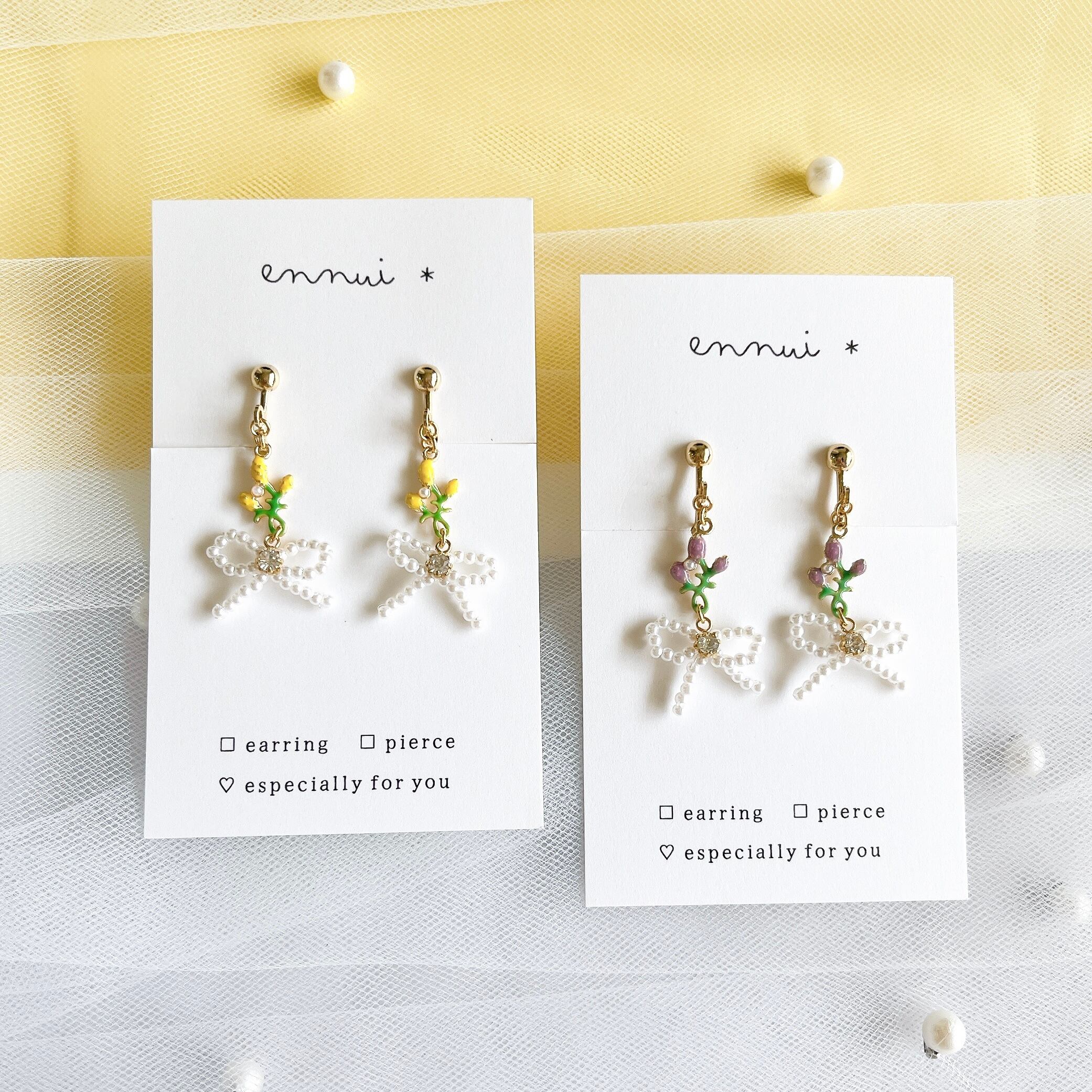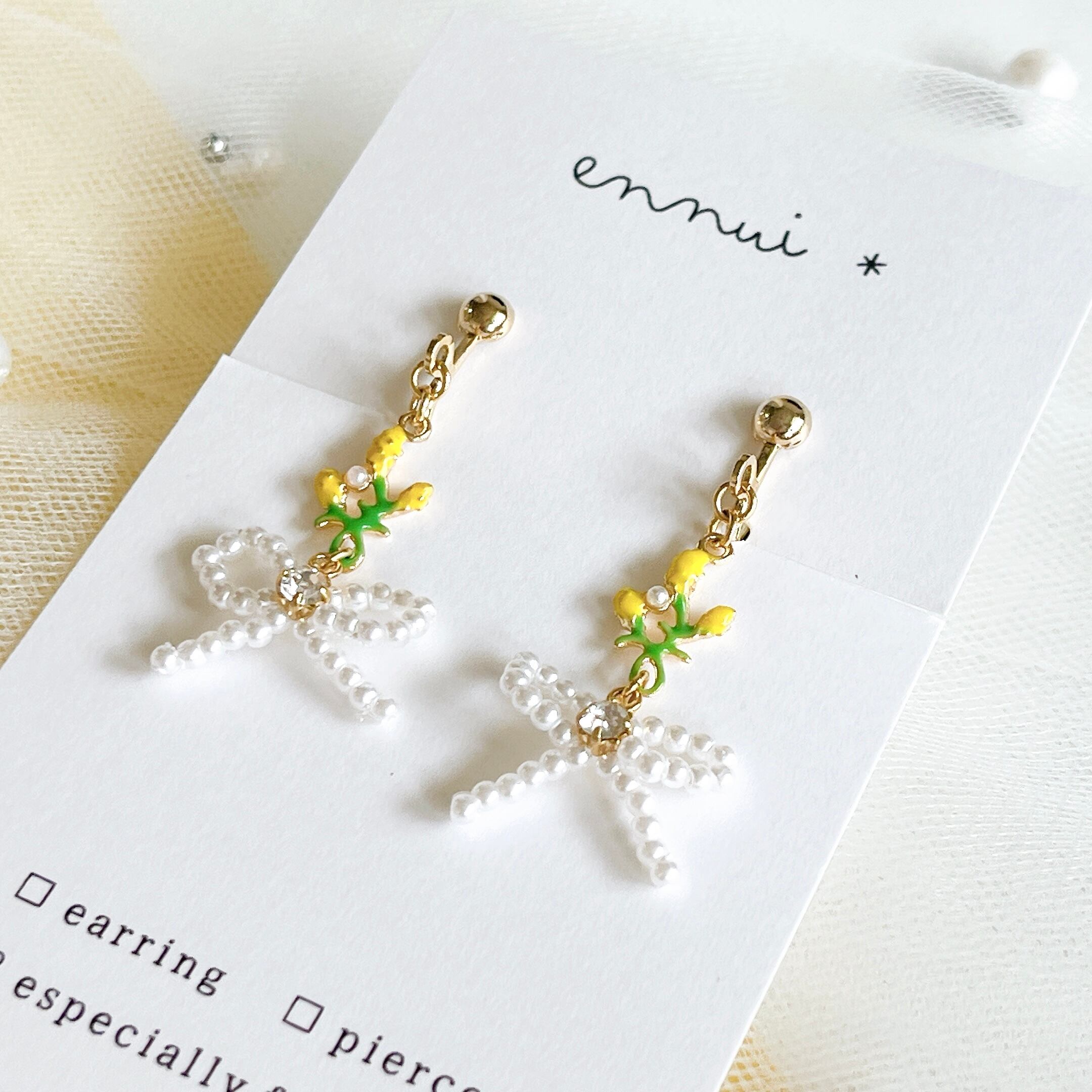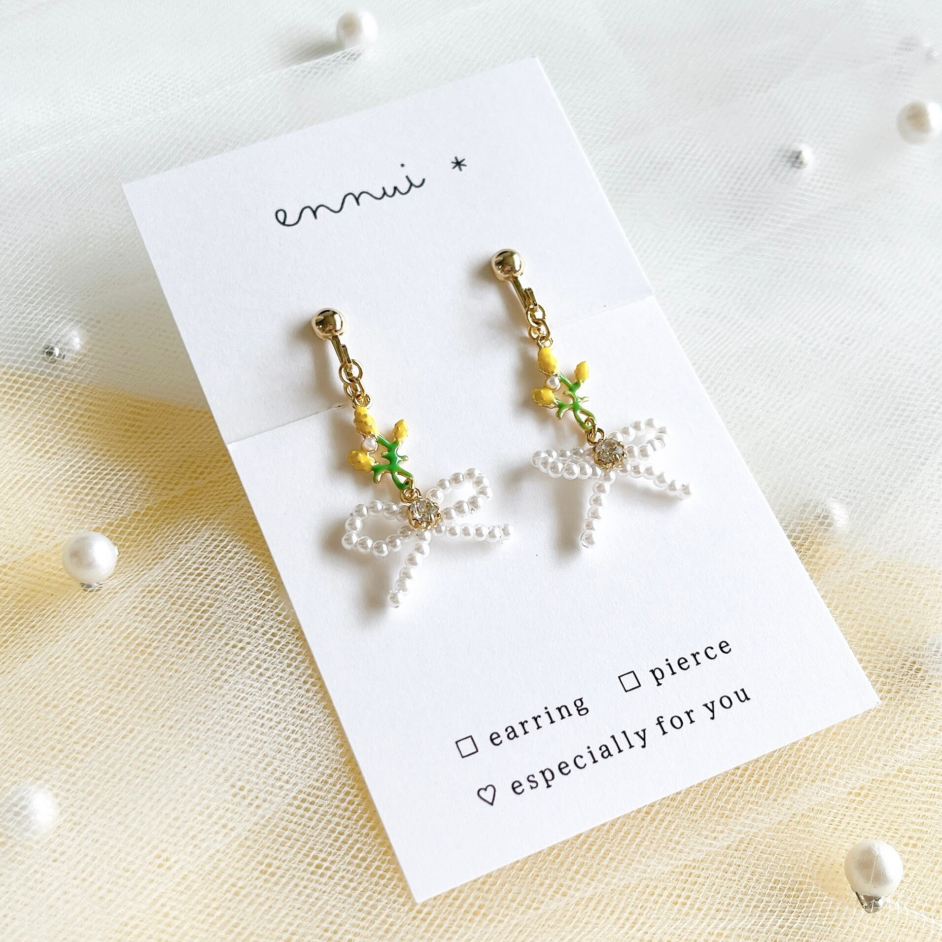 可憐なミモザのパーツと、小さなパールで作られたリボンで、夢見がちな少女のように甘い気分へ。